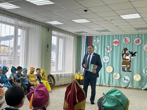 Петр Борисович вручил малышам экземпляры детского журнала "Солоҥы", книгу детского писателя Кӱлера Тепукова "Родина начинается с семьи".