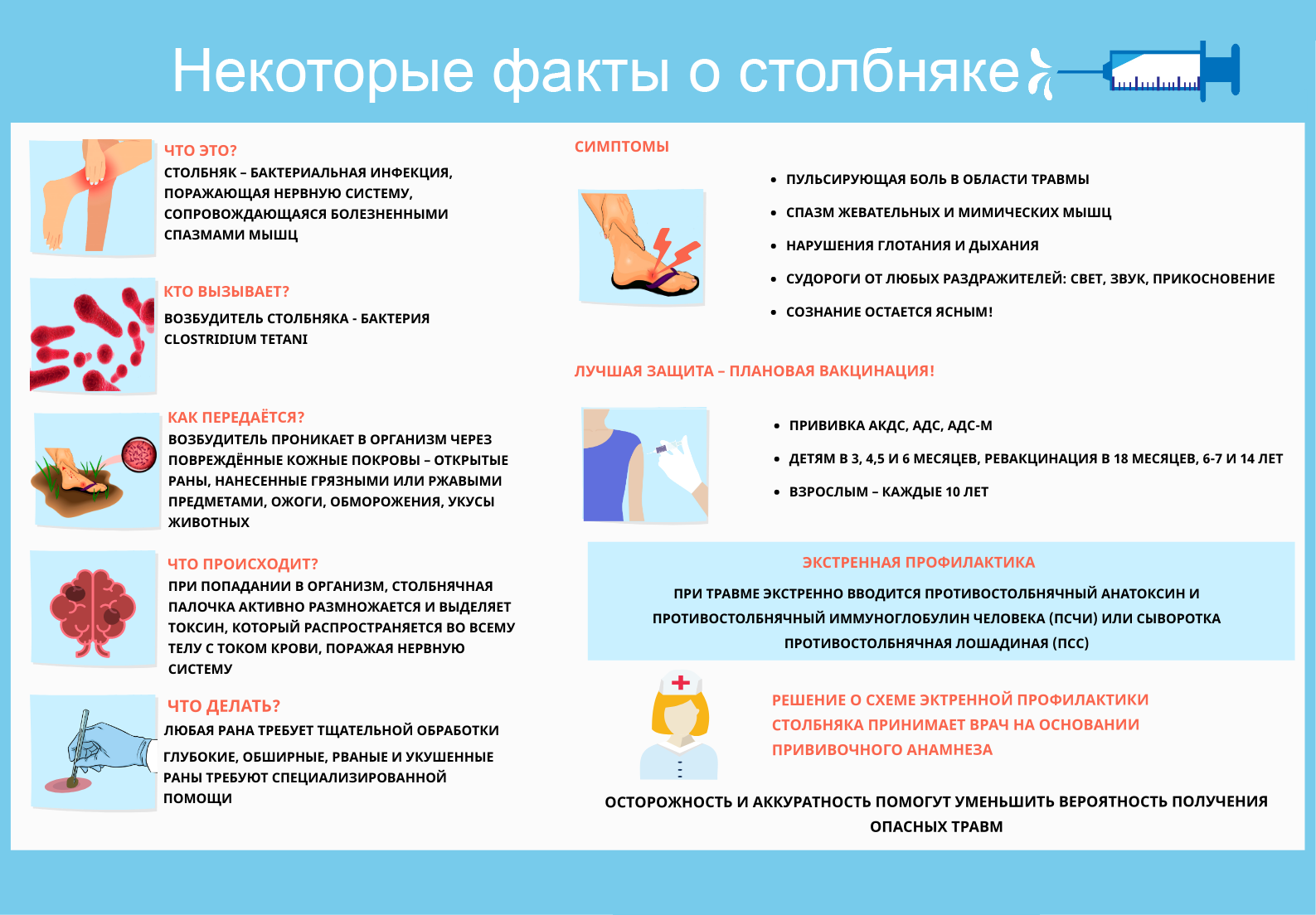 Столбняк - одно из тех заболеваний, которые эффективно предотвращаются при помощи иммунизации. Она проводится согласно национальному календарю профилактических прививок в медицинских организациях по месту жительства.