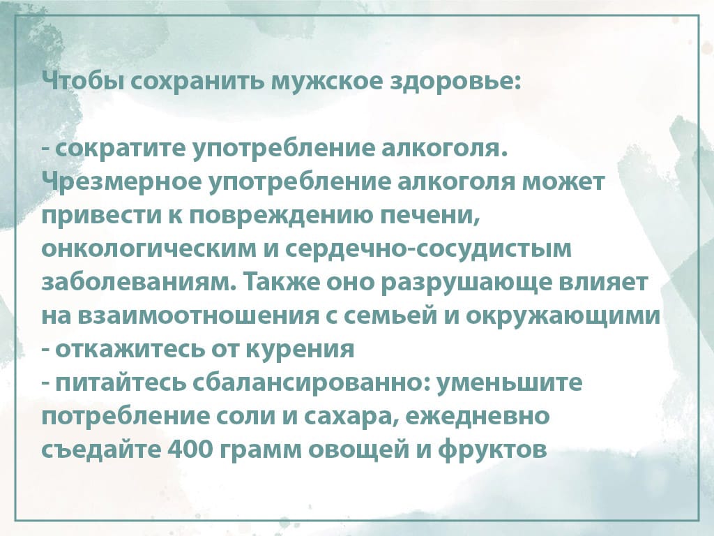 Первый шаг - регулярные медицинские обследования. Посещение уролога, проверка уровня тестостерона, контроль за состоянием сердечно-сосудистой системы и обследования на онкологические заболевания. Все это помогает своевременно выявить возможные проблемы и начать лечение.