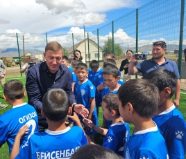 Андрей Турчак на площадке познакомился с чемпионкой Сибири по киокусинкай Амелией Аспембитовой и футбольной командой Еркиндоса Кожабаева «Алаш-Джуниор».