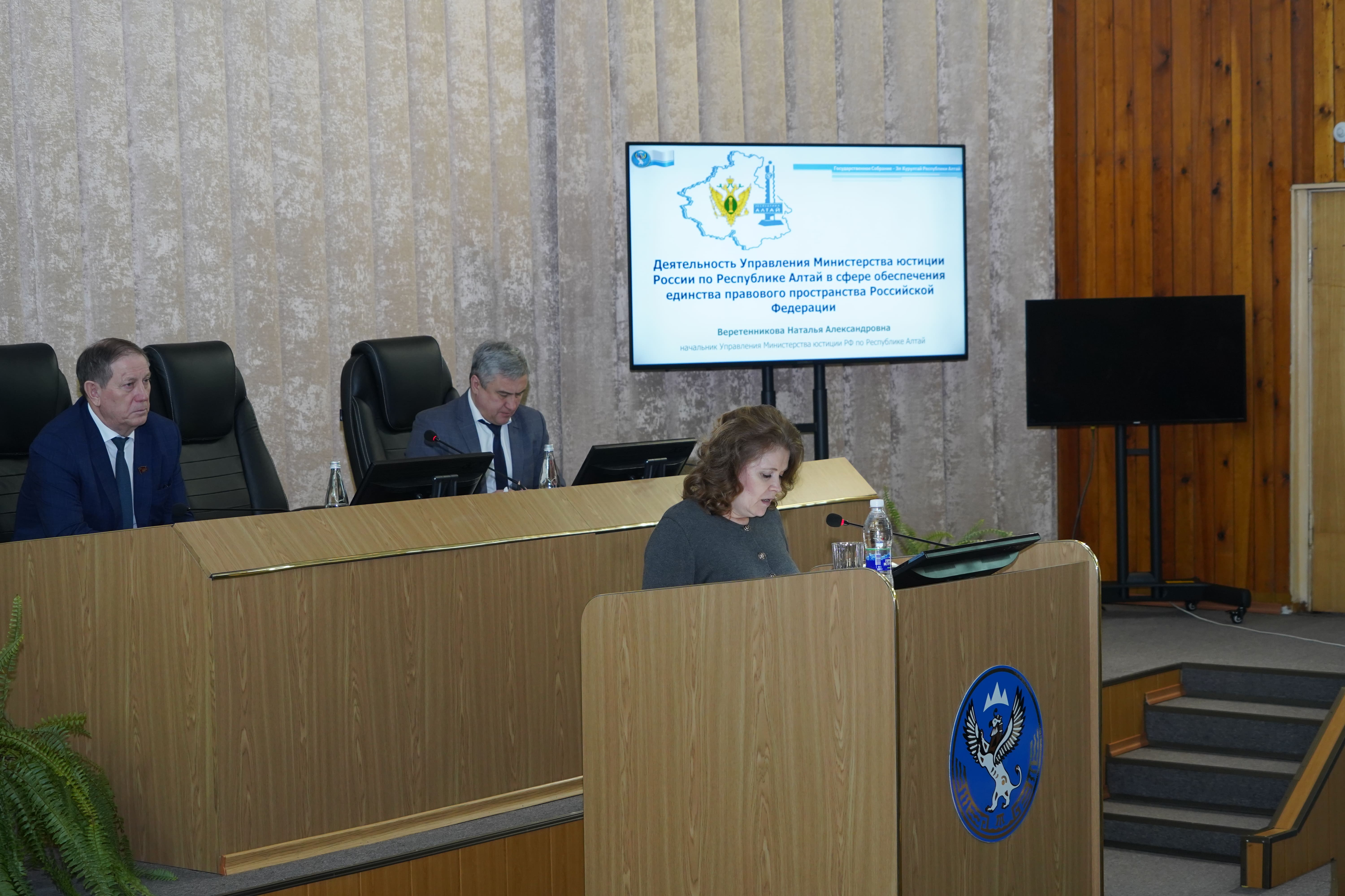 21 февраля 2024 года начальник Управления Минюста России по Республике Алтай Наталья Веретенникова выступила с докладом о деятельности Управления в сфере обеспечения единства правового пространства на ежегодном совещании Государственного Собрания-Эл Курултай Республики Алтай «О состоянии законодательства в Республике Алтай в 2023 году».