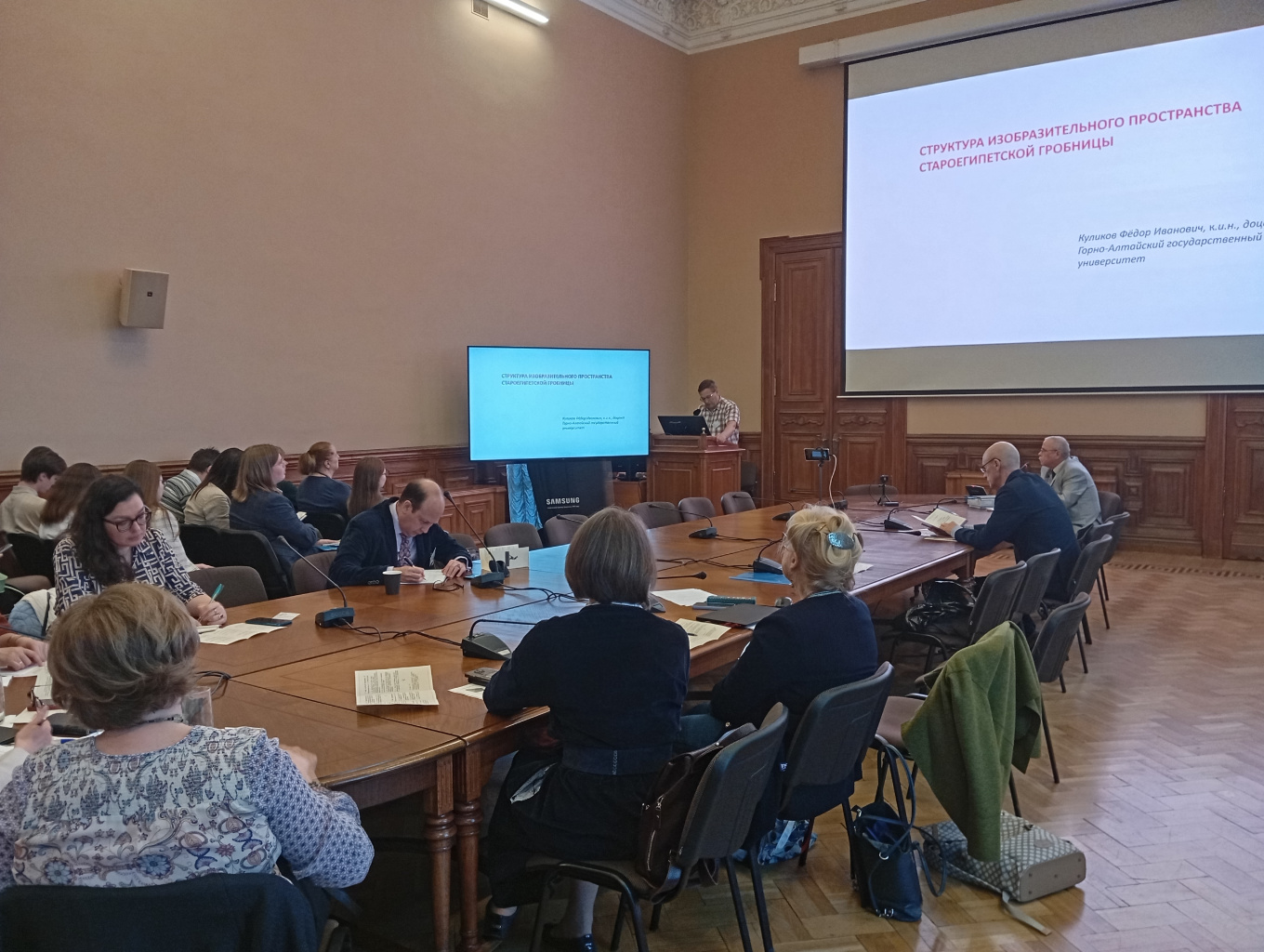 Фёдор Иванович выступил с докладом «Структура изобразительного пространства староегипетской гробницы», в котором показал, что изобразительное пространство, формируемое отдельными сценами и сюжетами, может корректировать архитектуру частного погребения периода Старого царства и придавать ей иное, непривычное нам назначение.