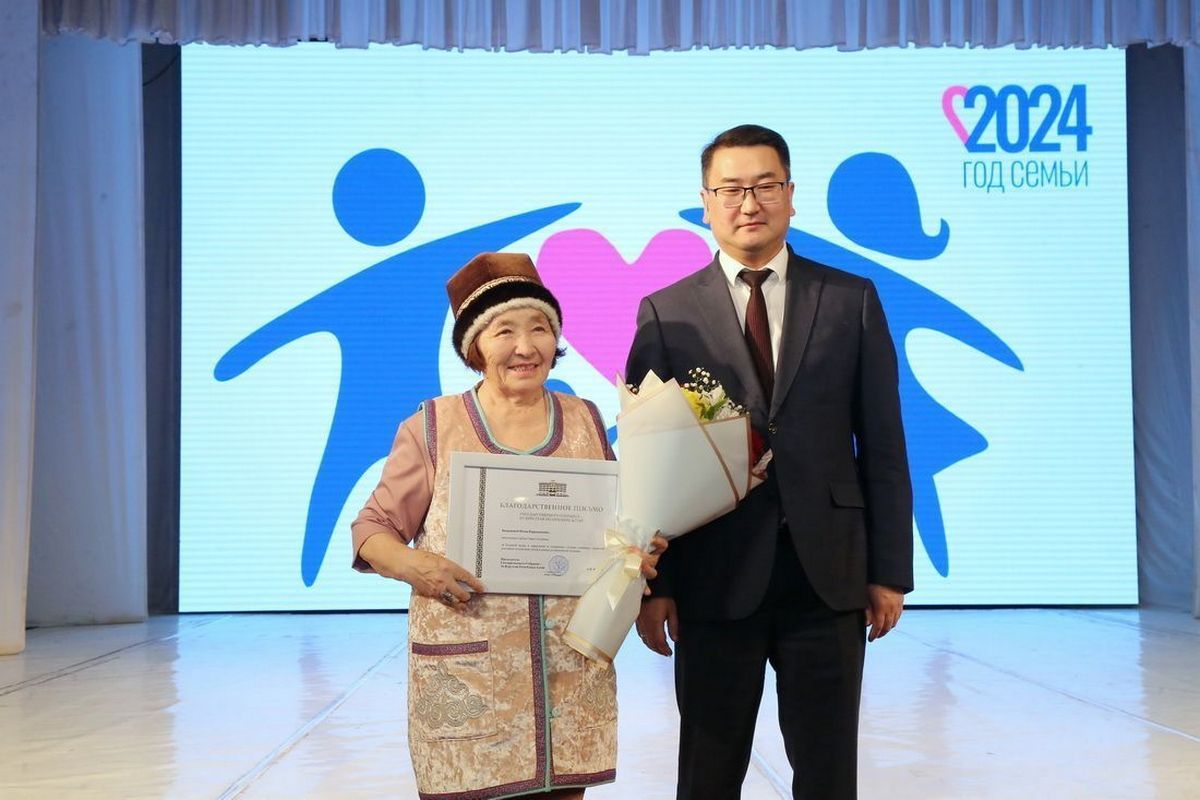 Знаком отличия «Быйанду Эне» («Почитаемая мать») отмечены жительница села Тюнгур Виктория Каланчина и Татьяна Акчина из Улагана. Знак отличия «Мактулу ада» («Отцовская слава») вручен жителю Чои Александру Манееву .