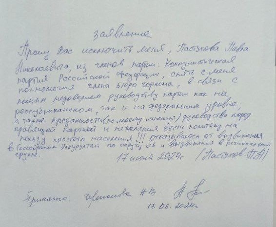 Также в заявлении Пастухов категорично заявил, что отказывается «от выдвижения в Госсобрание-Эл Курултай по округу №6 и выдвижения в региональной группе».