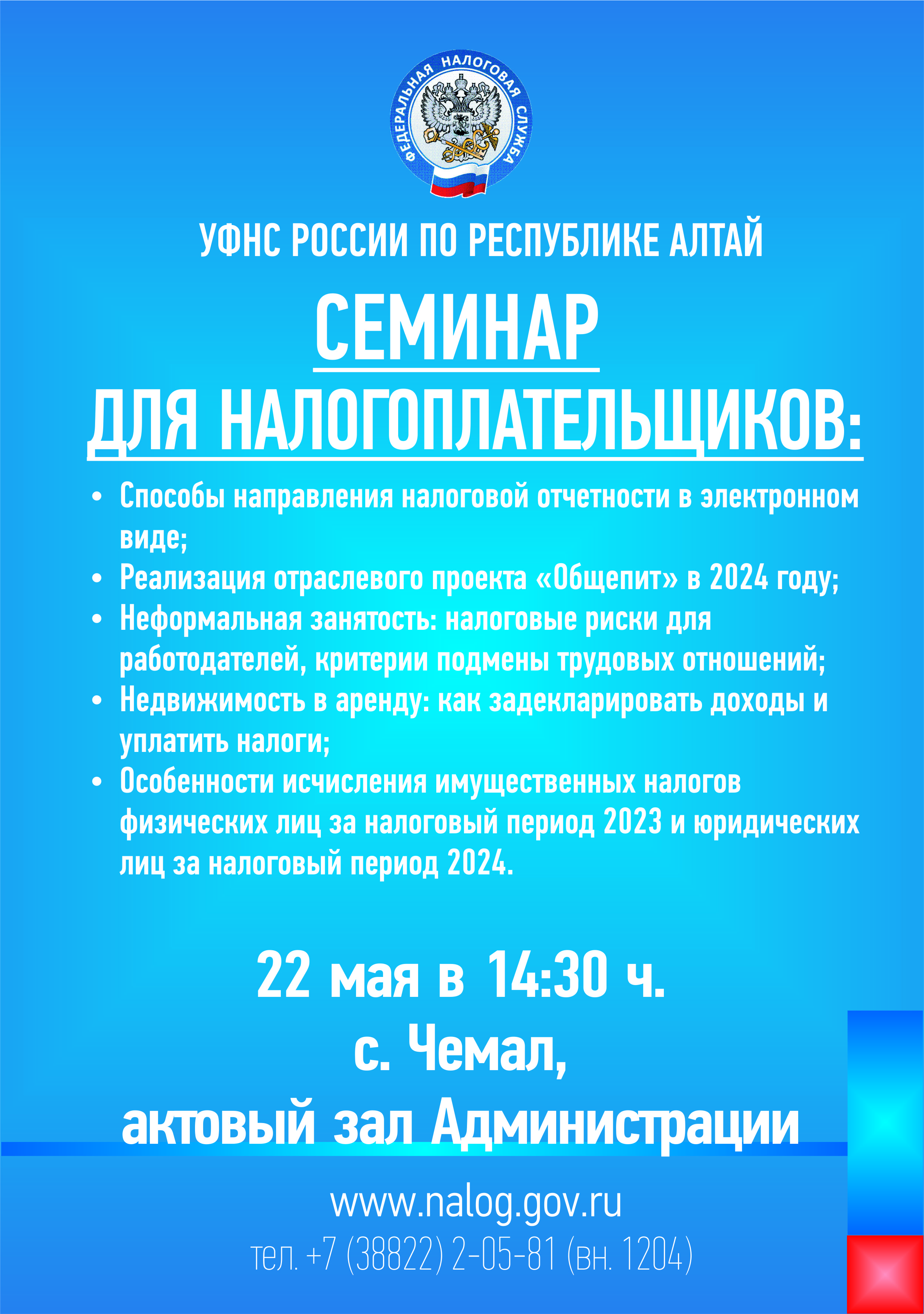 Семинар для налогоплательщиков пройдёт 22 мая в 14.30 ч. в здании администрации Чемальского района.