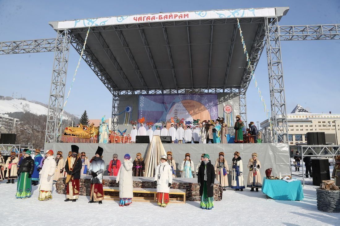 Далее на центральной площади города состоялись театрализованное представление, массовый обряд приветствия с рукопожатием «Öҥкӱр, öҥкӱр», праздничный ритуал зажжения священного огня Чага Байрам и алтайский хоровод «Чага байрамныҥ Кӱрее-jаҥары», в котором приняли участие все гости праздника.