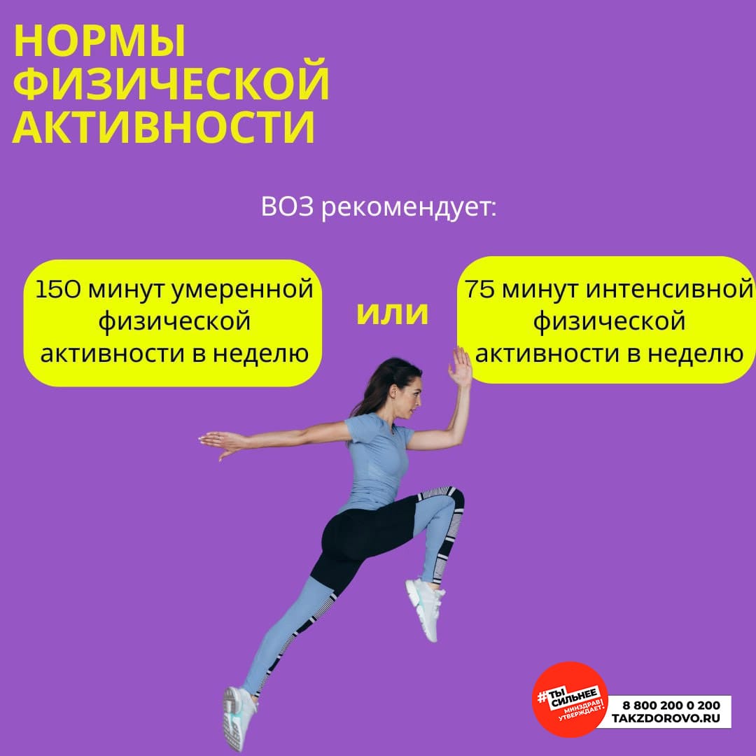- Всемирная организация здравоохранения (ВОЗ) рекомендует 150 минут умеренной физической активности или 75 минут интенсивной физической активности в неделю.
