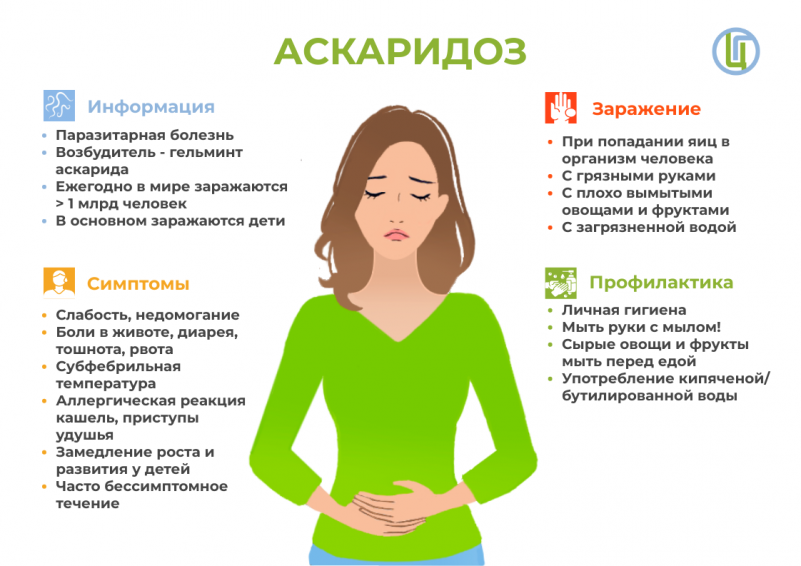 Аскаридоз – паразитарное заболевание, возбудителем которого являются такие глисты, как аскариды. Источником инфекции является только зараженный человек (животное не может быть источником аскаридоза). Основной путь заражения — пищевой. Созревшие яйца вместе с почвой попадают на овощи, фрукты, зелень. Если продукты недостаточно хорошо промыть, то яйца будут проглочены и окажутся в кишечнике. Также яйца аскарид могут попасть в организм с немытых рук — так чаще всего аскаридозом заражаются дети. Клиническая картина: высыпания аллергического характера, раздражительность, повышение температуры тела, слабость, сонливость, головокружение, озноб, одышка, кашель, боль и тяжесть в животе, изжога, отрыжка.